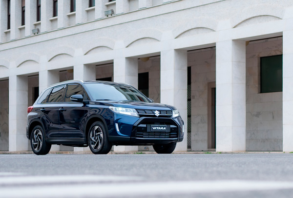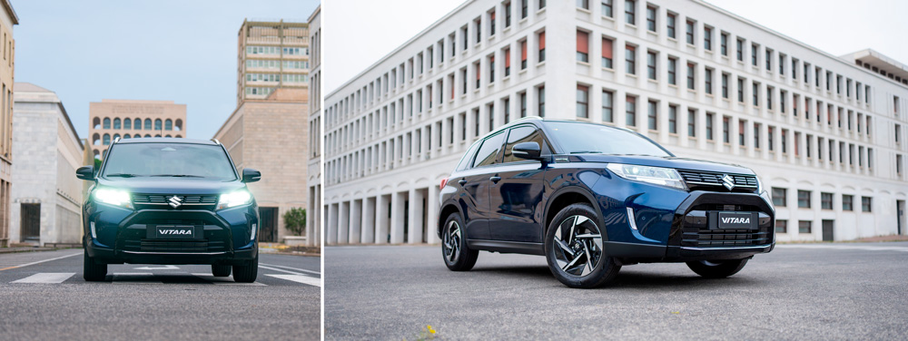 Vitara augšupejošo siluetu un autentisko SUV stilu papildina agresīva dizaina spīdīgi melns priekšējais režģis, izteiksmīgi priekšējie spārni un sašaurināti LED priekšējie lukturi. Vitara ir aprīkots ar 17″ vieglmetāla diskiem.
